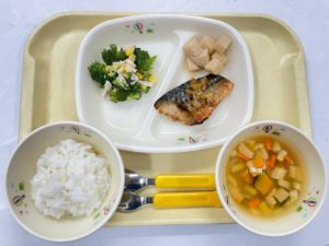 1/21(水)【ごはん・さばの香味焼・ブロッコリーのチキンサラダ・具だくさん汁】