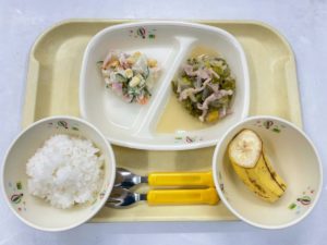 3/9(月)【ごはん・豚肉とピーマンの細切り炒め・ポテトサラダ・バナナ】