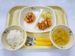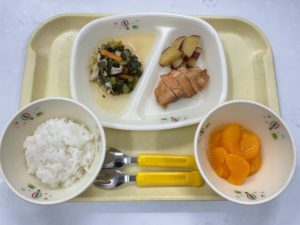 1/8(木)【ごはん・鶏肉の照り焼き・小松菜の煮浸し・みかん缶】