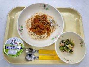 【夏野菜ミートソース・白菜と小松菜のサラダ・食べる煮干し・ヨーグルト】