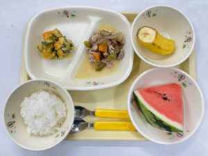本日の給食 8/8(金)【ごはん・炒り鶏・かぼちゃの胡麻サラダ・バナナ(すいか)】 ※本日、スイカ割りをしました。 給食にスイカを提供しています(^^♪ よく一緒に読まれている記事 本日の給食 本日の給食 本日の給食 本日の給食 本日の給食 本日の給食 本日の給食 本日の給食