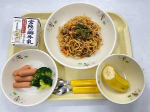 本日の給食 2/10(火)【焼きそば・ボイルウインナー・ブロッコリー・バナナ・牛乳】 ※青のりはお好みでかけています よく一緒に読まれている記事 本日の給食 フォークに上手く巻き付けて 一足お先の節分メニュー♬ 久々の 焼きそばの発祥 キャベツの歴史 本日の給食と放課後手づくりおやつ みんな大好きウインナー♪